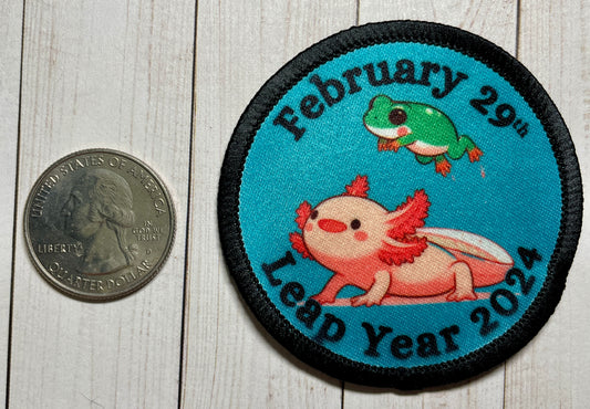 Cookie Season February 29th Leap Year 2024 Axolotl & Frog Sublimated Patch | 2.57" Iron-On | Polyester Design | Leap Year Celebration 2024